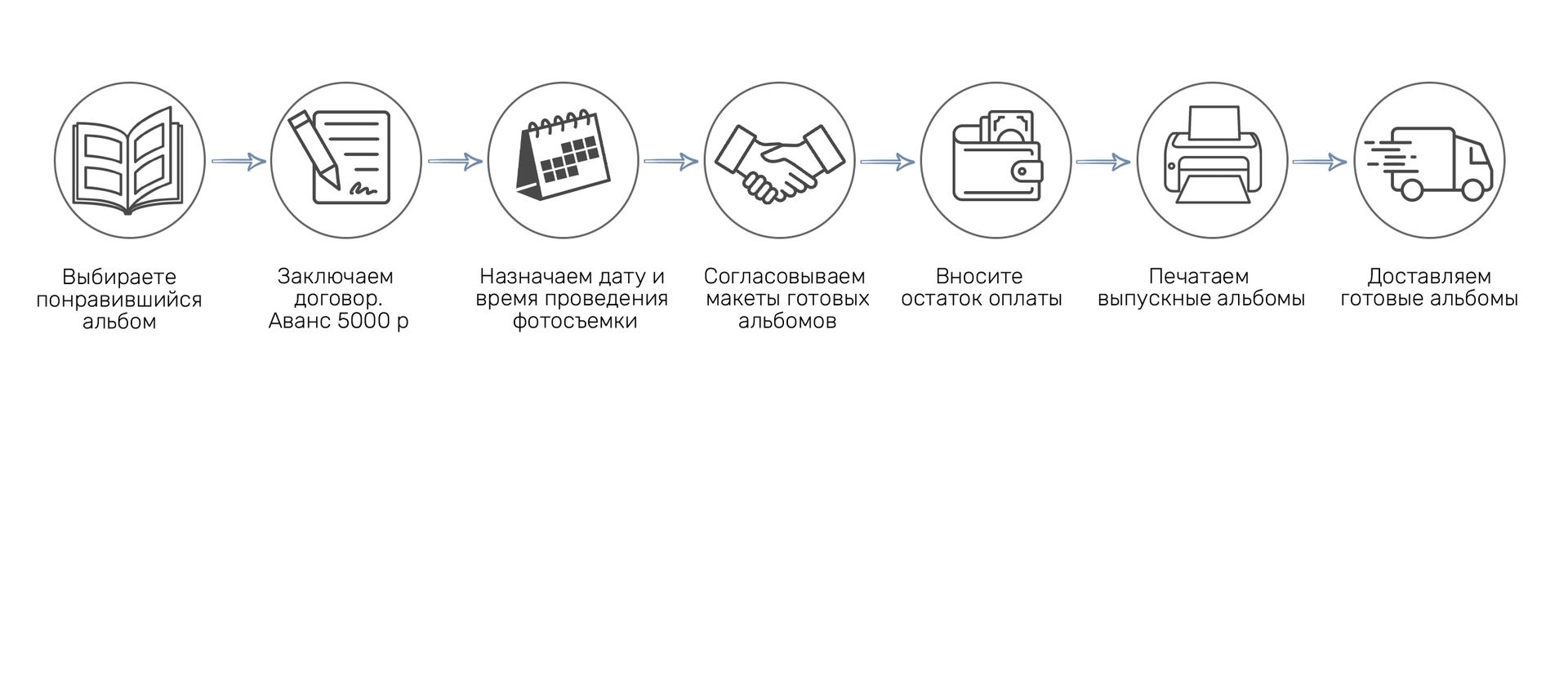 - два выезда фотографа (+ 1 доп выезд для съемки отсутствующих)